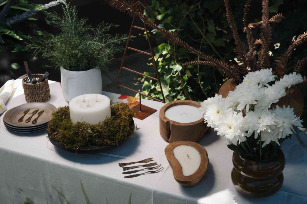 Blancos, cremas y maderas se combinan con verdes frescos que aportan un aire orgánico y limpio a la mesa. La gran vela circular, apoyada sobre un nido de musgo, se convierte en el foco visual y lumínico: un objeto contundente que eleva la escena sin exagerar.
