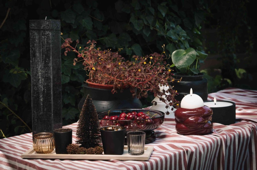 El espíritu navideño reinterpretado desde el diseño. Esta mesa combina tonos profundos (bordó, negro, dorado y blanco) para crear un clima más nocturno y sofisticado. La vela escultórica roja y blanca es la protagonista absoluta, mientras que el camino rayado aporta ritmo visual.